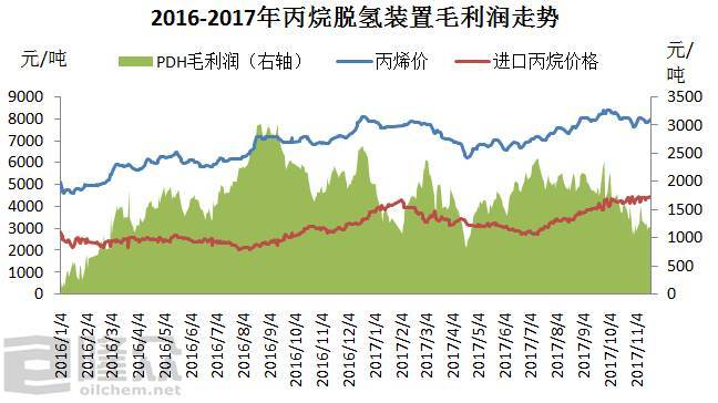 由上圖可見,2016-2017年丙烷脫氫毛利潤表現樂觀,裝置均無虧損情況,尤其在夏季,受原料氣丙烷價格低位,使丙烷脫氫裝置獲利更為理想。華南地區是國內進口氣集中地,而丙烷脫氫裝置,工藝來源于國外,原料氣丙烷也基本依賴進口,裝置在華南投產建設,原料提供方便。目前,華南地區的進口丙烷資源多作為工業氣或者搭配丁烷或者搭配當地煉廠氣今日民用市場,均是作為提供熱值的燃料,據隆眾數據監控,2016年華南進口毛利潤在257/噸左右,2017年至今進口毛利潤在194/噸左右,相比丙烷脫氫裝置利潤優勢十分明顯。