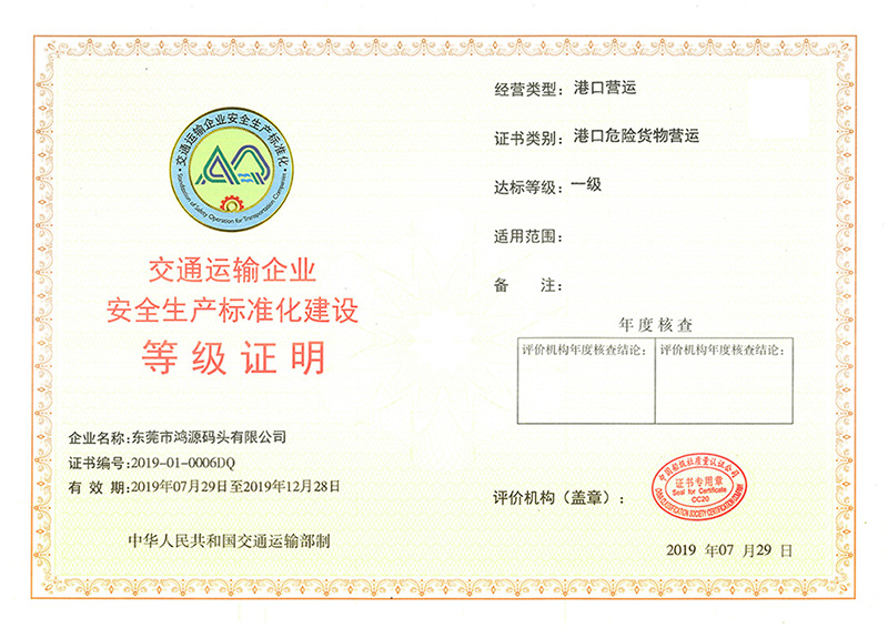 日前,巨正源所屬盛源石化、鴻源碼頭正式獲得由國(guó)家交通運(yùn)輸部頒發(fā)的“交通運(yùn)輸企業(yè)安全生產(chǎn)標(biāo)準(zhǔn)化建設(shè)一級(jí)達(dá)標(biāo)企業(yè)證書(shū)”,這標(biāo)志著盛源石化、鴻源碼頭安全生產(chǎn)管理邁上標(biāo)準(zhǔn)化、規(guī)范化的新臺(tái)階。